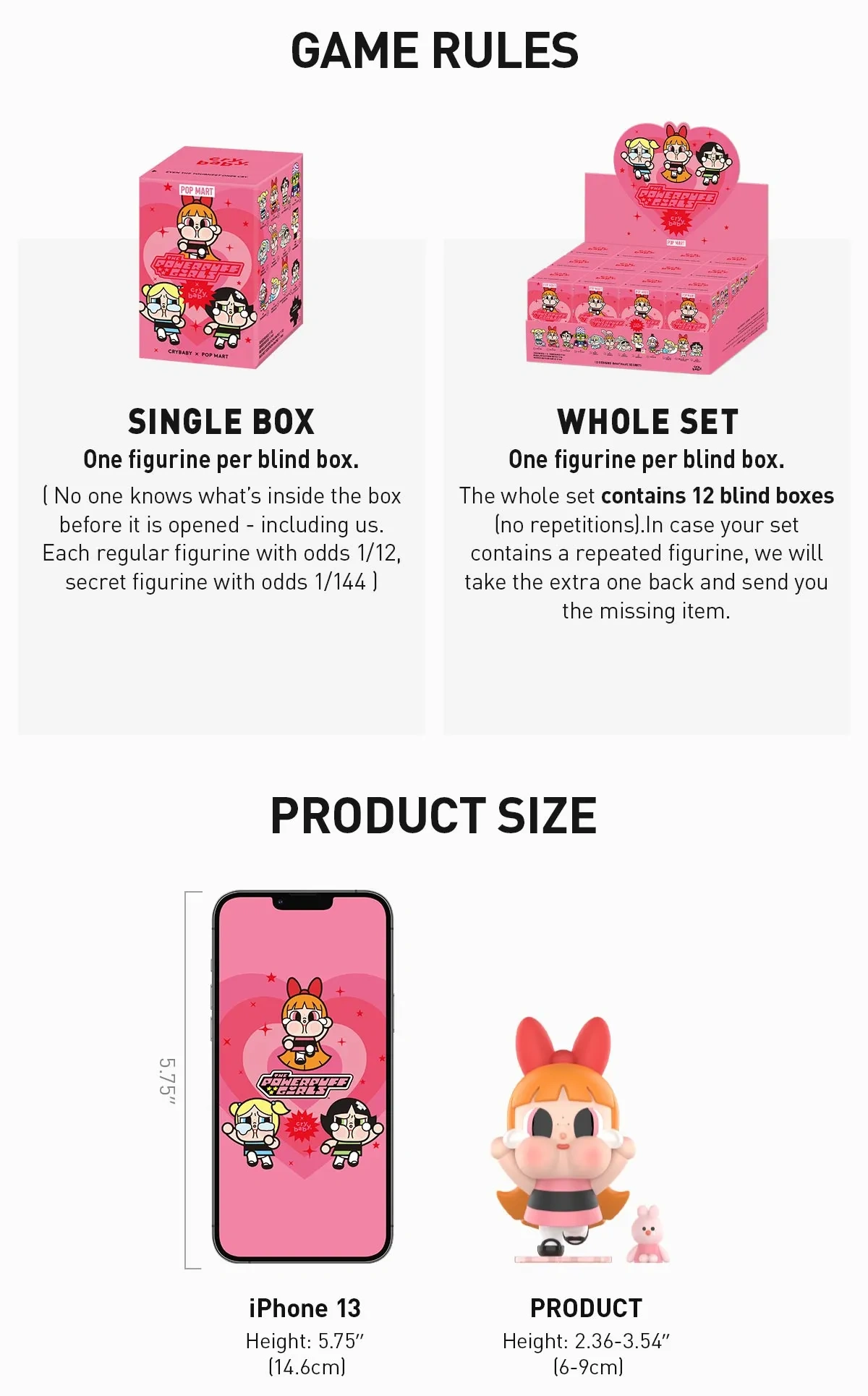 THE MONSTERS Almost Hidden Series Figures Brand: POP MART Release Date:April 12,2024 Material: ABS/PVC Height:2.75-4.29inches Not suitable for persons under 15. *Due to differences in measurement methods, the actual measurements may vary within anormal range of 0.19- 0.39 inches. Actual product size and color may appear different due to lighting, display screen specifications, photography style and other factors. Display picture and size are for reference only.